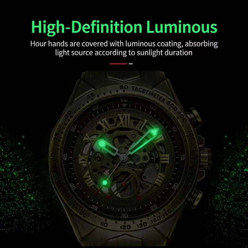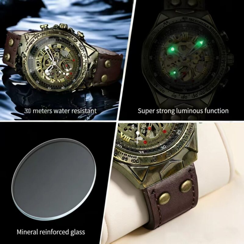 Men’s Vintage Fashion Mechanical Watch – Business Skeleton Brass Wristwatch with Leather Strap(F8-1)