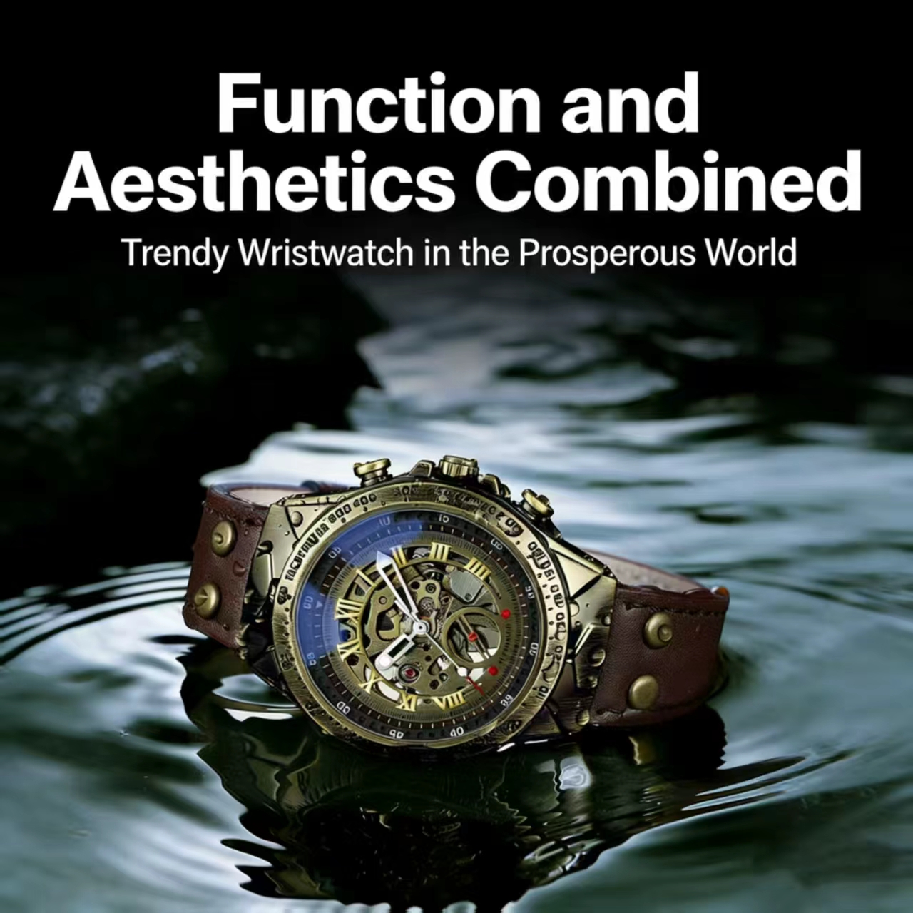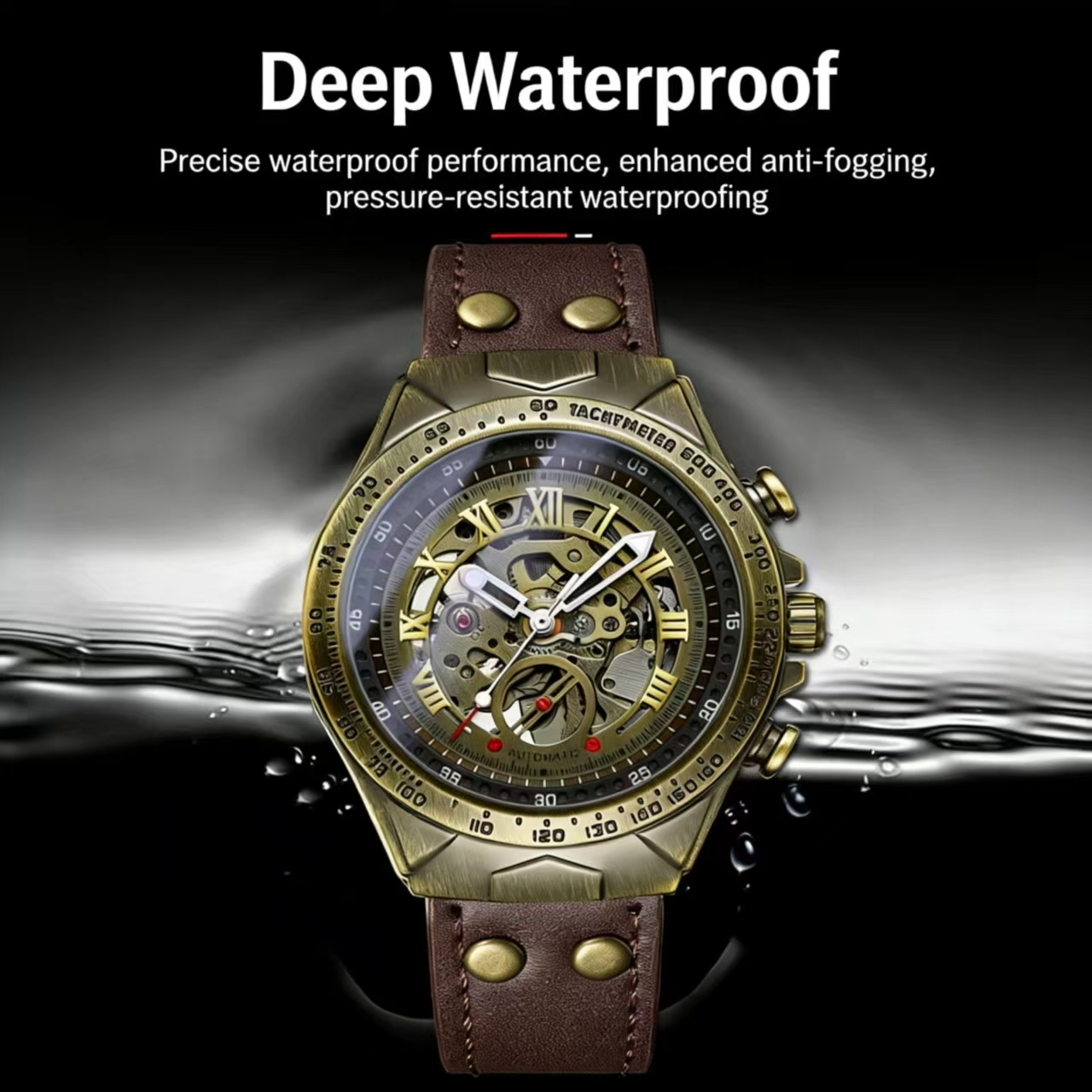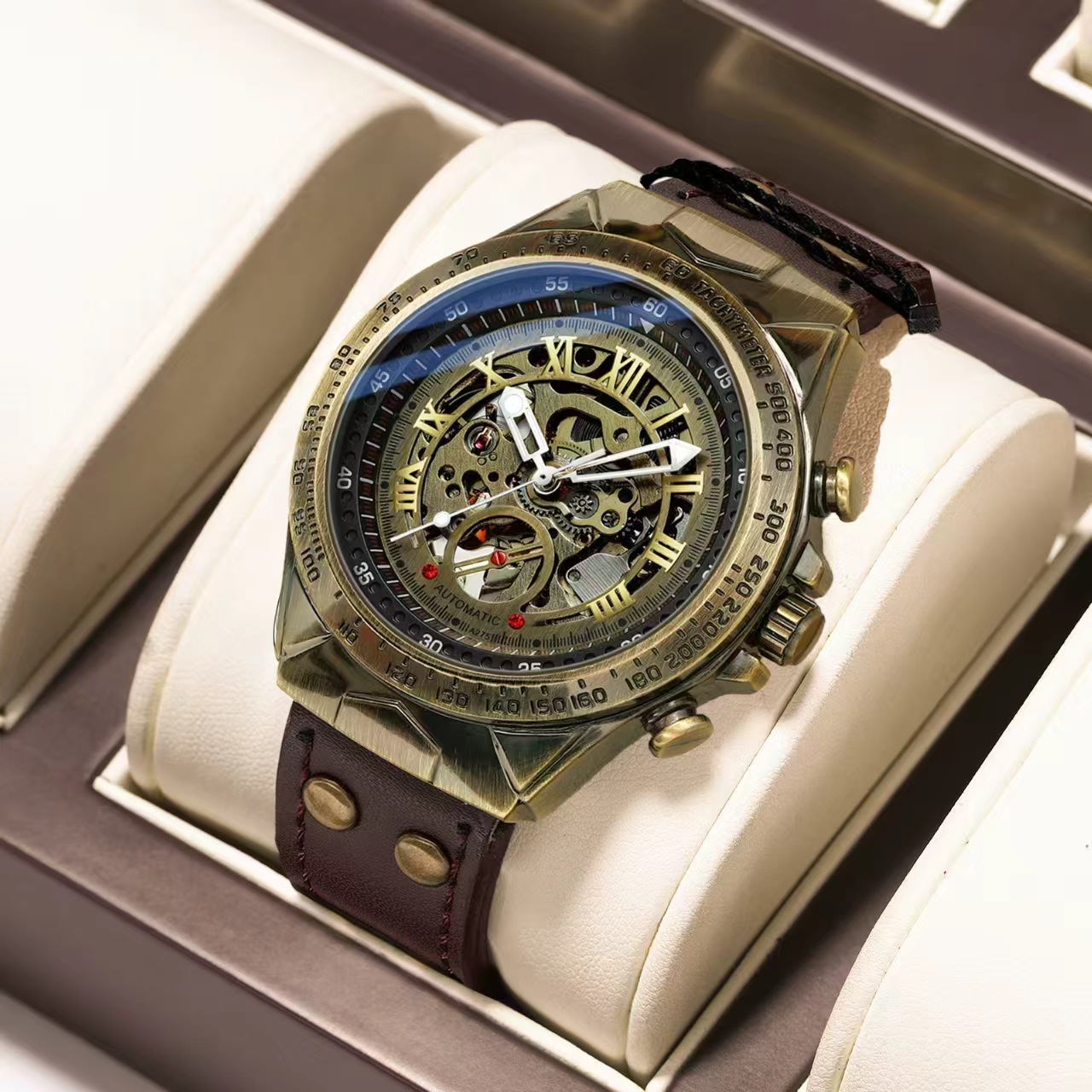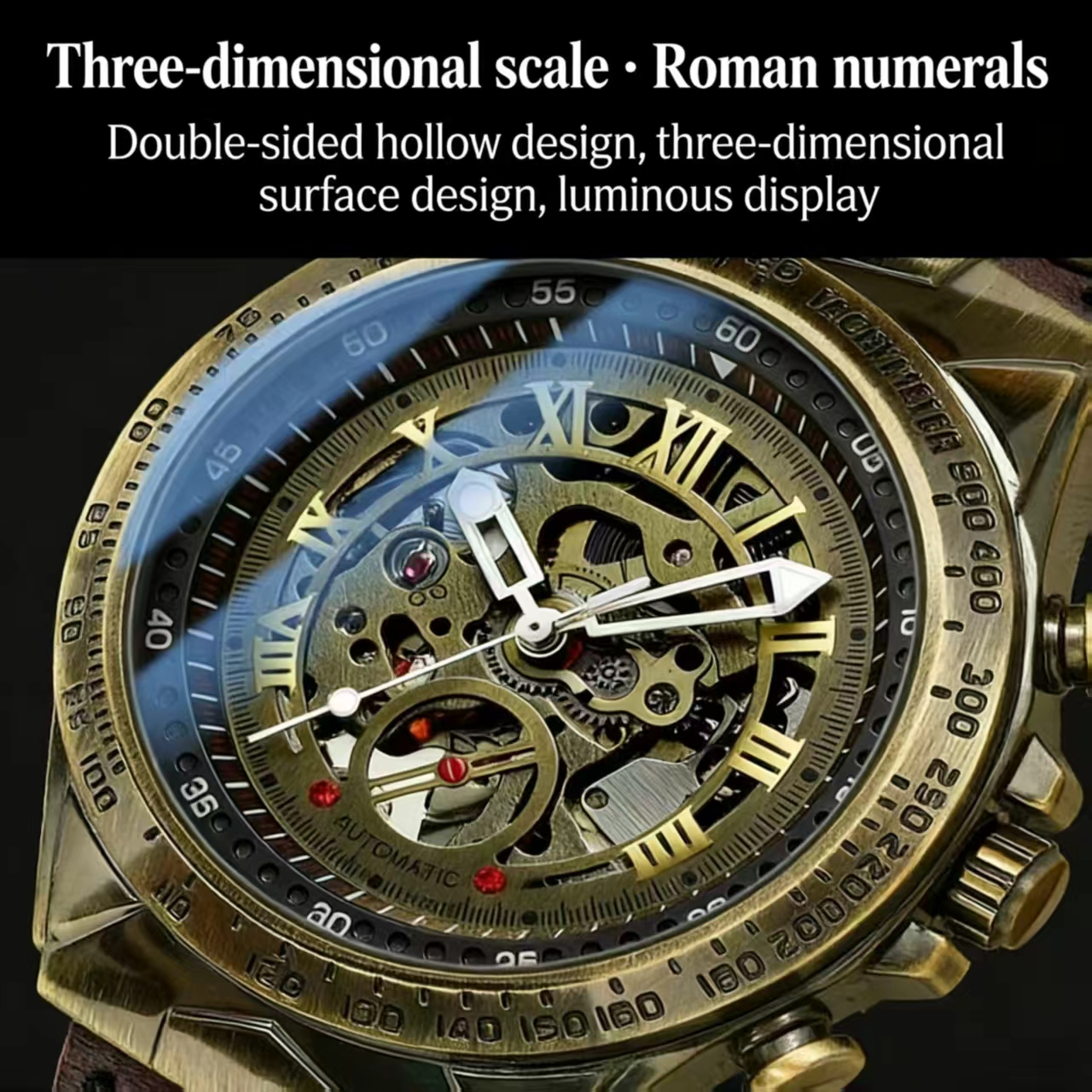 Men’s Vintage Fashion Mechanical Watch – Business Skeleton Brass Wristwatch with Leather Strap(F8-1)