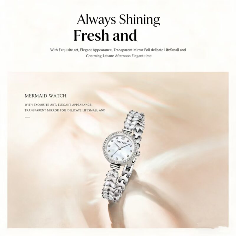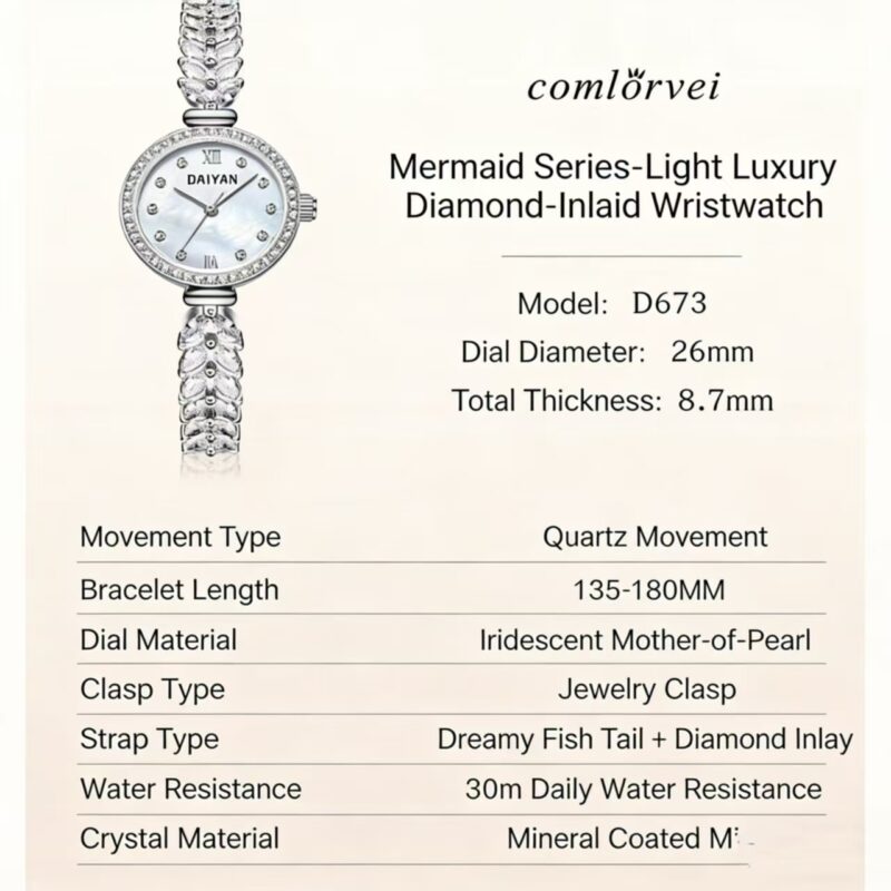 This elegant women’s quartz watch features a delicate mermaid-tail crystal bracelet, a shimmering mother-of-pearl dial, and a sparkling crystal bezel. It offers 30M daily water resistance and a comfortable fit, perfect for everyday wear or gifting