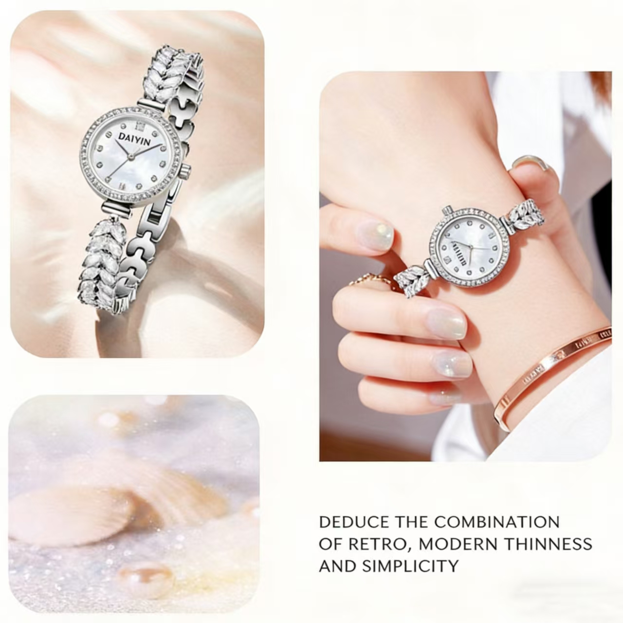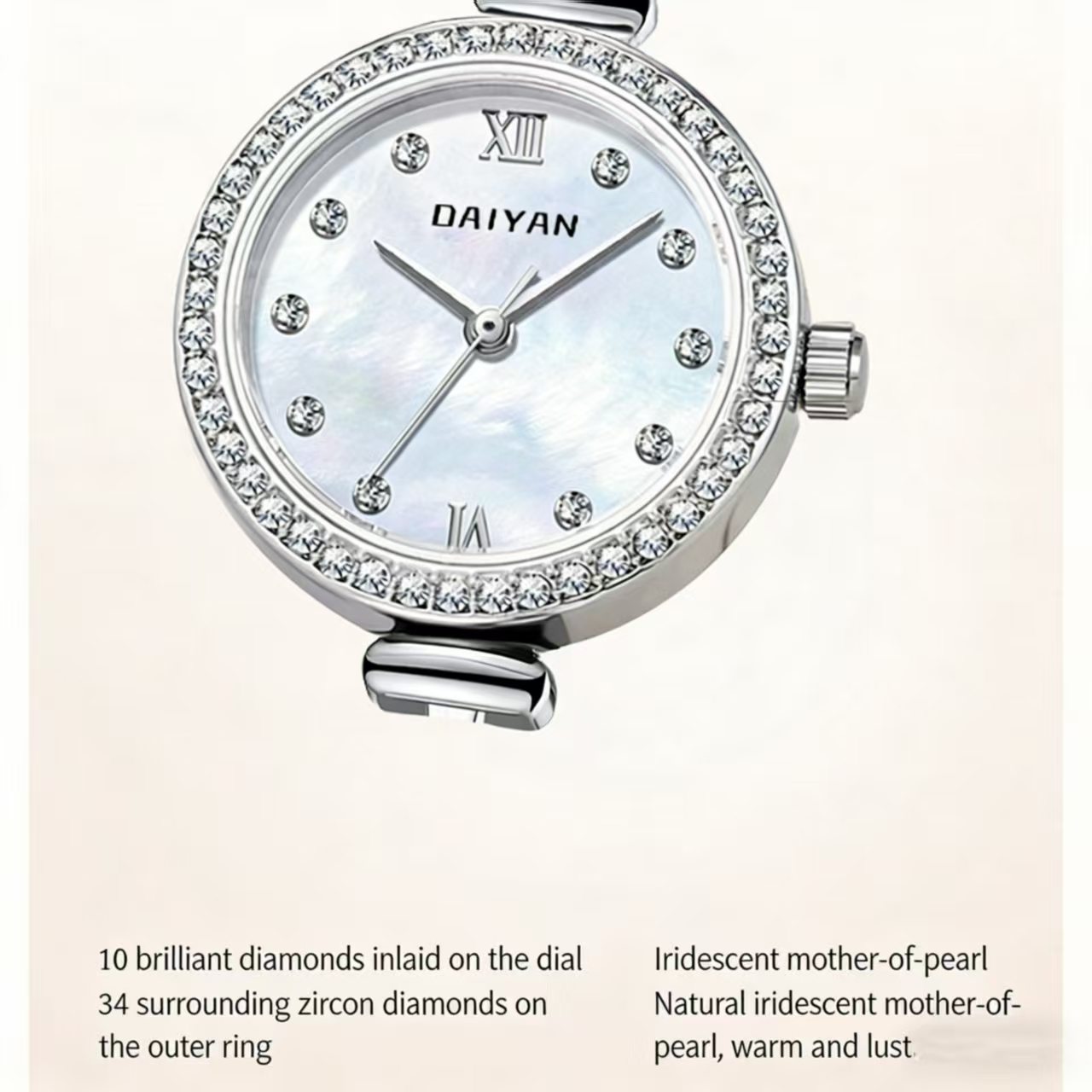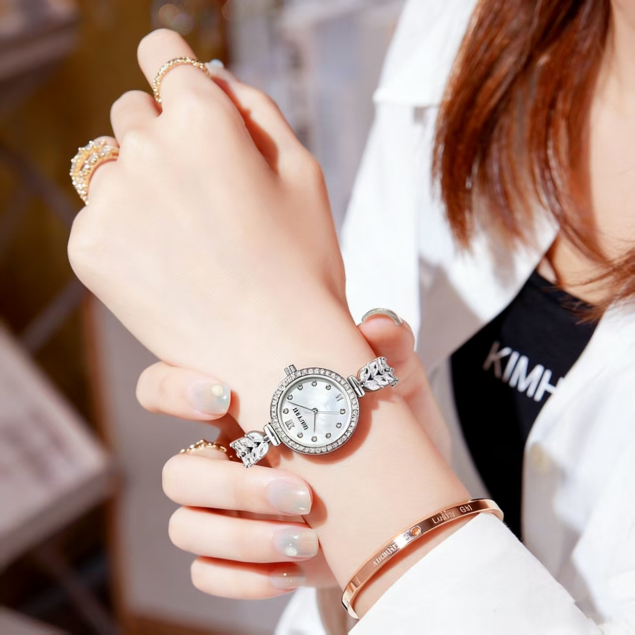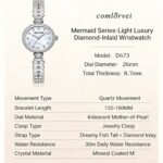 This elegant women’s quartz watch features a delicate mermaid-tail crystal bracelet, a shimmering mother-of-pearl dial, and a sparkling crystal bezel. It offers 30M daily water resistance and a comfortable fit, perfect for everyday wear or gifting