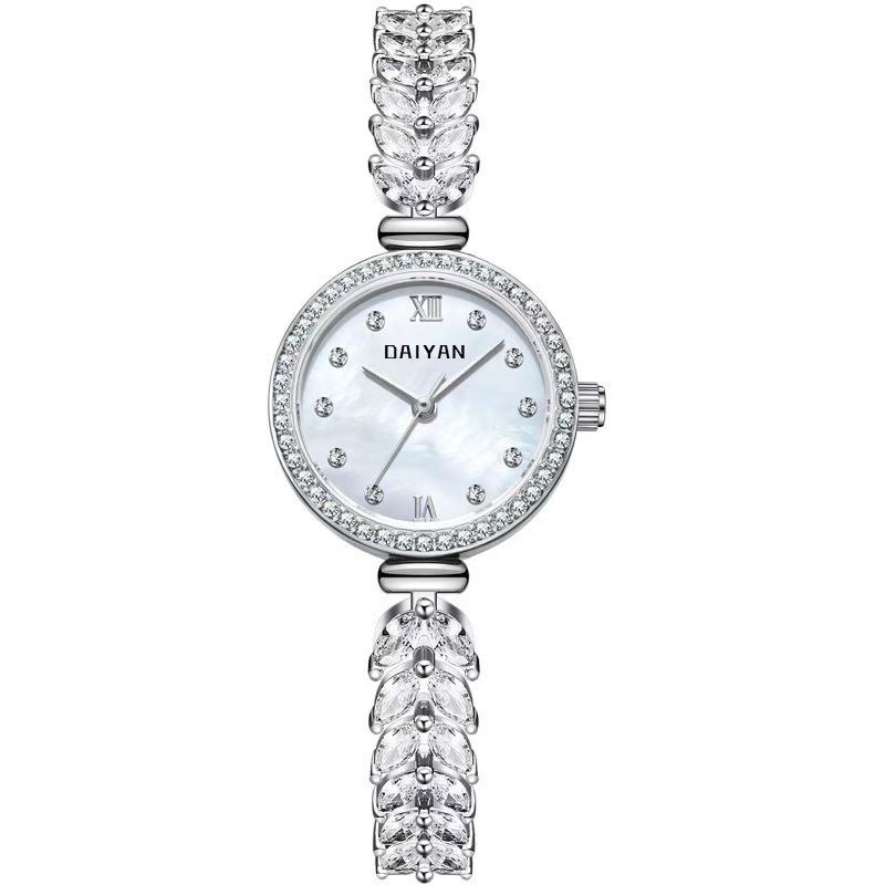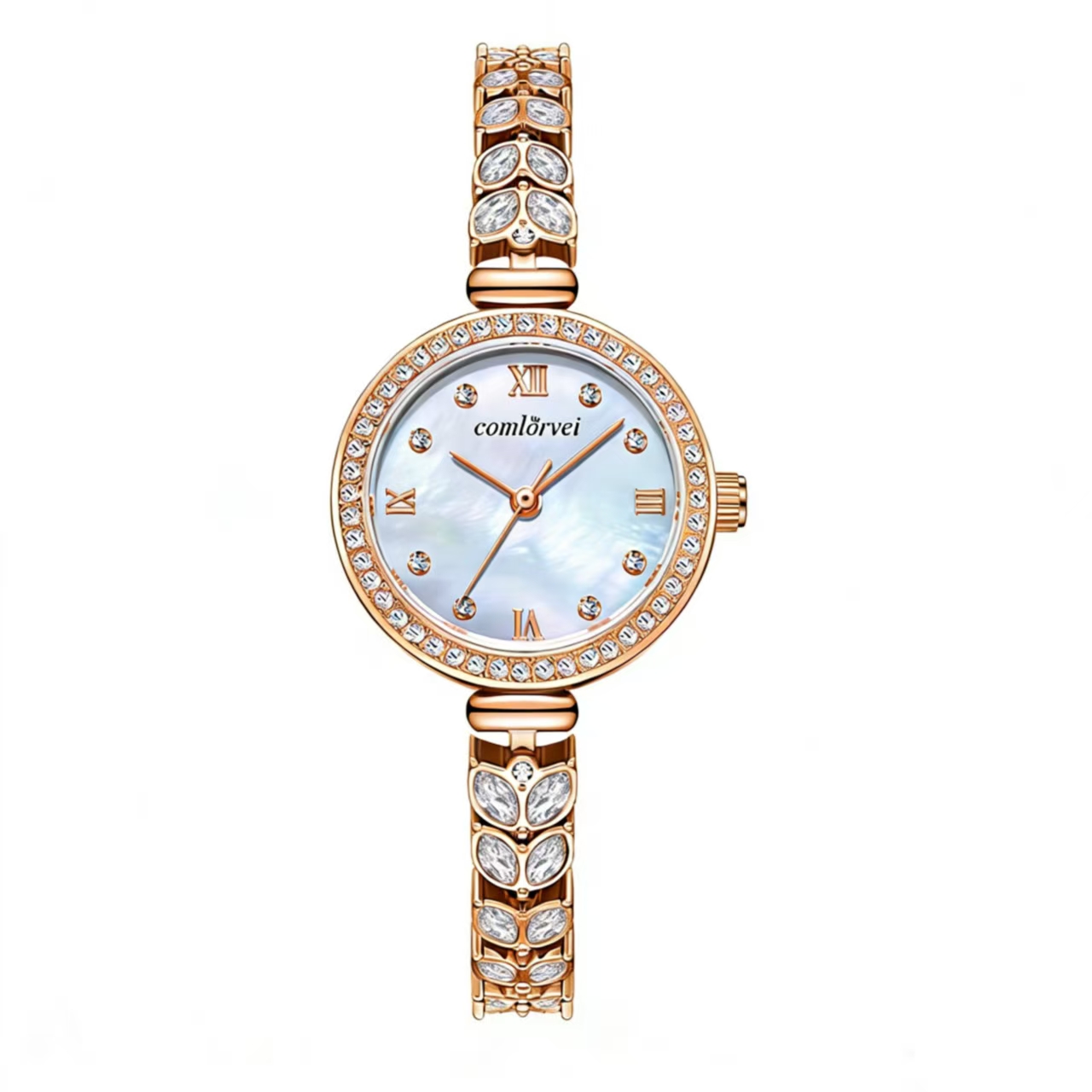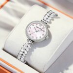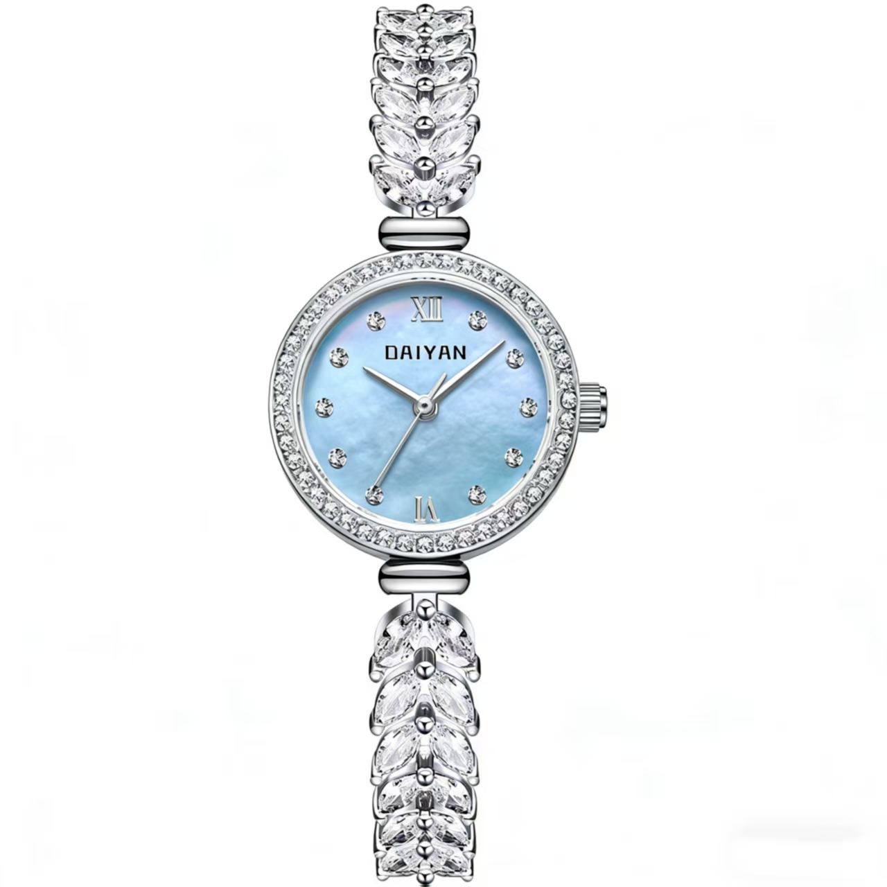 This elegant women’s quartz watch features a delicate mermaid-tail crystal bracelet, a shimmering mother-of-pearl dial, and a sparkling crystal bezel. It offers 30M daily water resistance and a comfortable fit, perfect for everyday wear or gifting